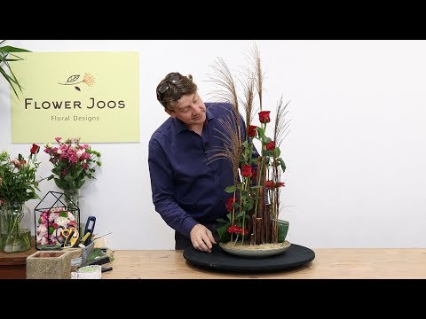 How To Make A Modern Red Rose Plate Design For Valentine's Day Ingredients - 1 x plate or shallow dish, wet floral foam, sand, twigs for structure, good red roses, 2 x red gerbera, miscanthus grasses, aspidistra leaves.